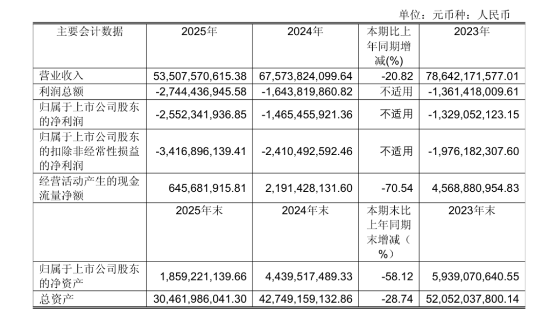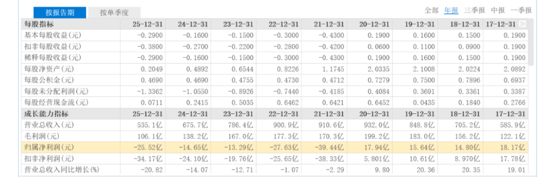 2022年,亏损27.63亿元;2023年,亏损收窄至13.29亿元;2024年,亏损14.65亿元;到了2025年,亏损进一步加剧,直接亏掉25.52亿元。