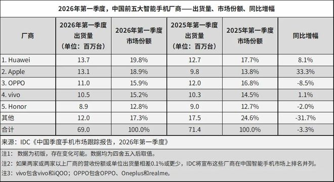 4月中旬,Omdia和IDC先后发布了2026年第一季度中国智能手机市场报告:华为稳居第一,苹果第二,OPPO和vivo分列三四名。