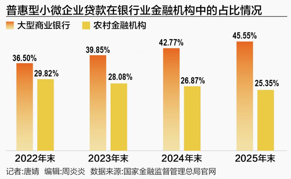 根据金融监管总局发布的2025年银行业金融机构普惠型小微企业贷款情况,截至2025年四季度末,大型商业银行的此类贷款在银行业金融机构中的占比达到45.55%,已接近半壁江山,且从一季度至四季度呈逐步提升态势。农村金融机构的占比则逐季下降,四季度末降至25.35%,仅占四分之一的市场份额。