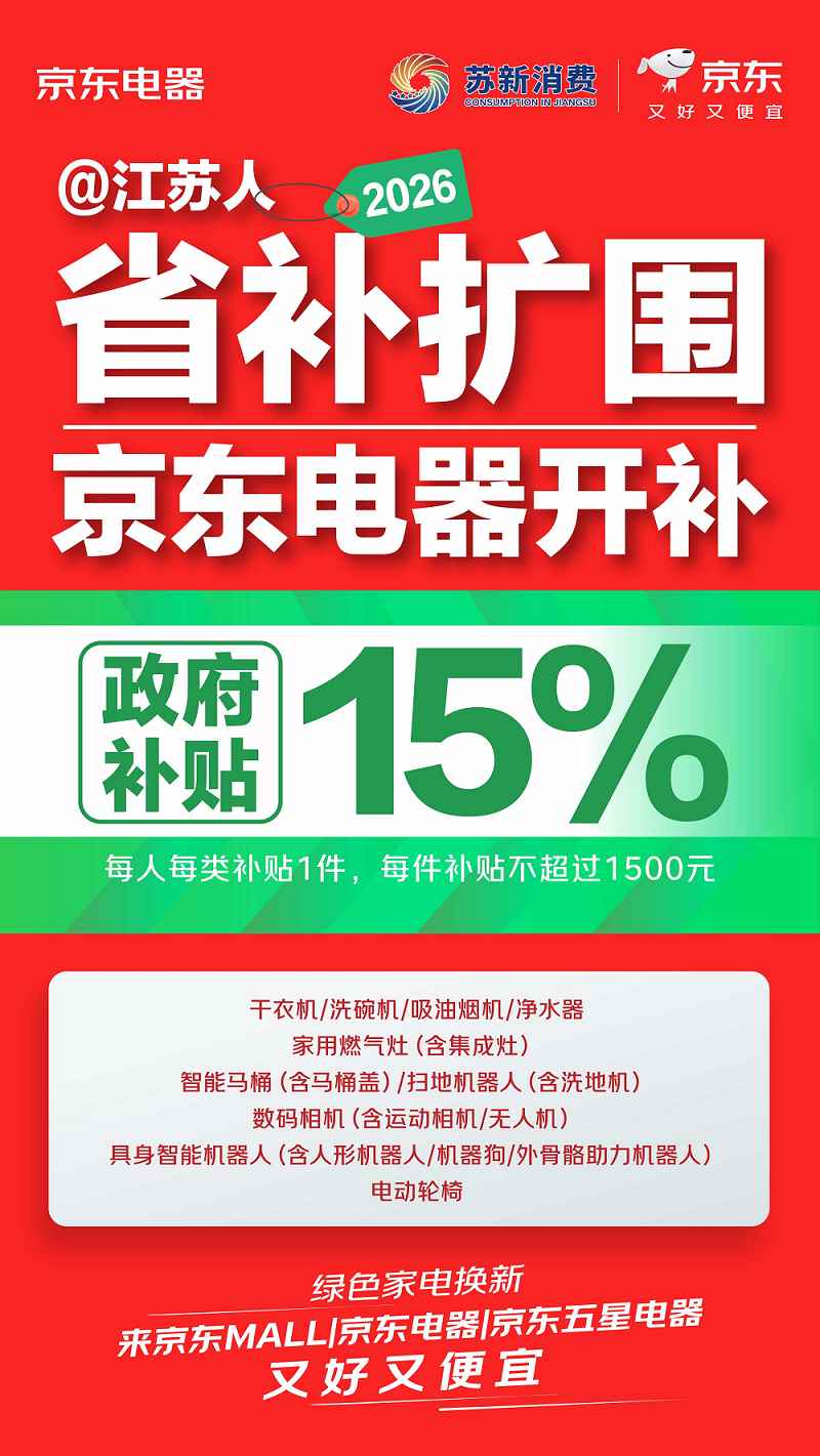 根据江苏省商务厅发布的《关于实施江苏省2026年消费品以旧换新地方自主品类补贴政策的通告》,在2026年国补10大品类的基础上,新增10大类进行江苏省自主补贴,包括干衣机、洗碗机、吸油烟机、家用燃气灶(含集成灶)、净水器、智能马桶(含马桶盖)等智能家居产品(含适老化家居产品);扫地机器人(含洗地机)、数码相机(含运动相机、无人机)、具身智能机器人(含人形机器人、机器狗、外骨骼助力机器人)等“人工智能+”新一代智能终端;以及电动轮椅。消费者购买上述品类商品,可享受扣除各环节优惠后最终销售价格的15%的补贴,每人每类可补贴1件,每件补贴最高不超过1500元。新增商品须具有统一国标13位商品编码,其中有能效或水效标识的,须为中国能效或水效标识1级且已在能效或水效标识网备案。补贴政策至2026年12月31日结束,限额管理,用完即止。