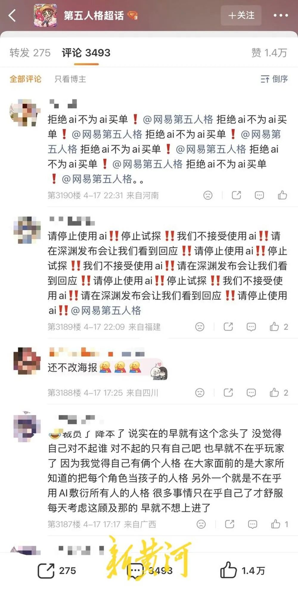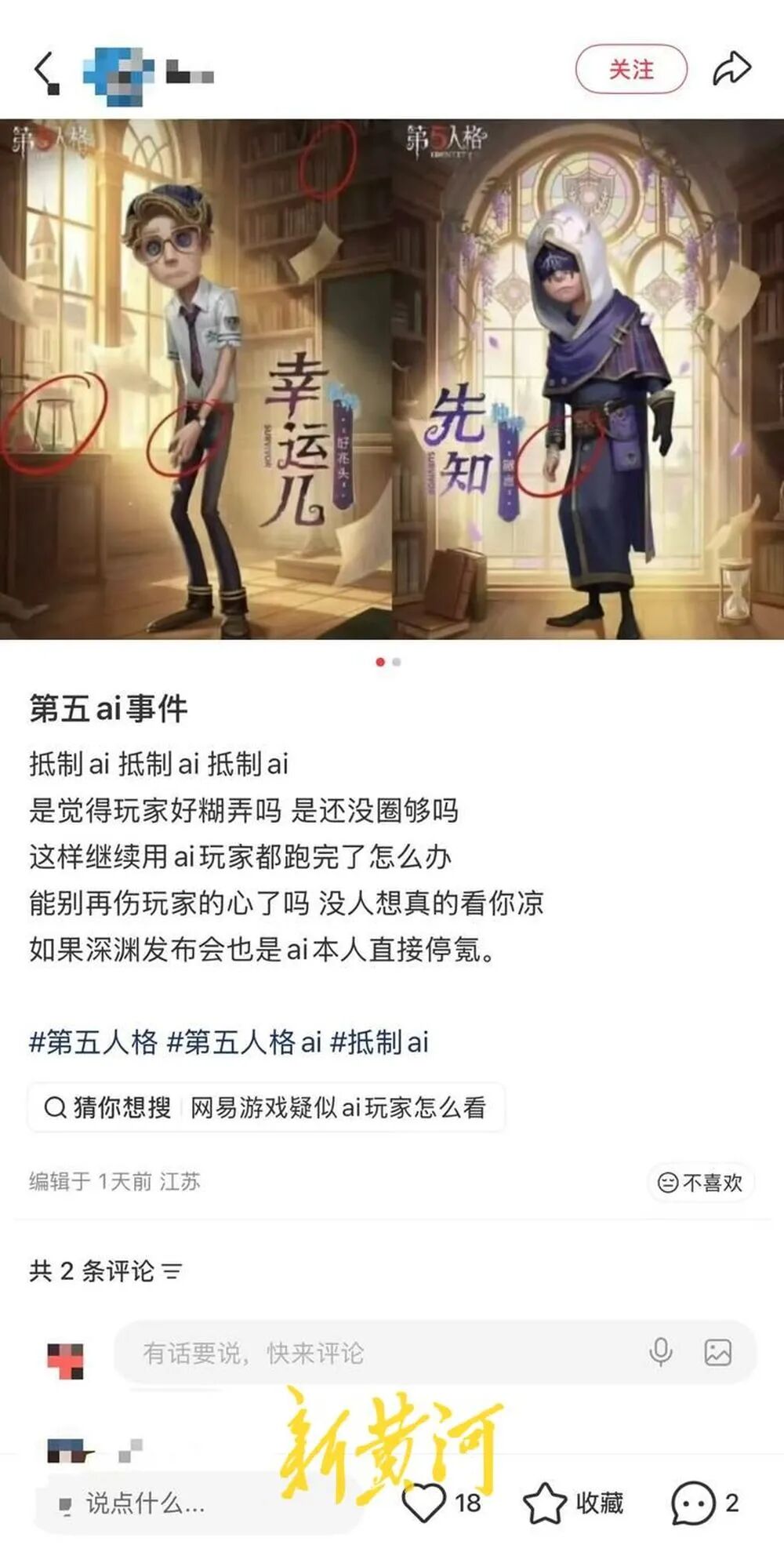 然而《第五人格》至今未做相关回应。4月17日下午,新黄河记者向官方客服反映此问题,客服表示仅支持游戏内问题处理,无法回答关于AI争议的问题,并提醒记者可留意游戏公告及后续更新。