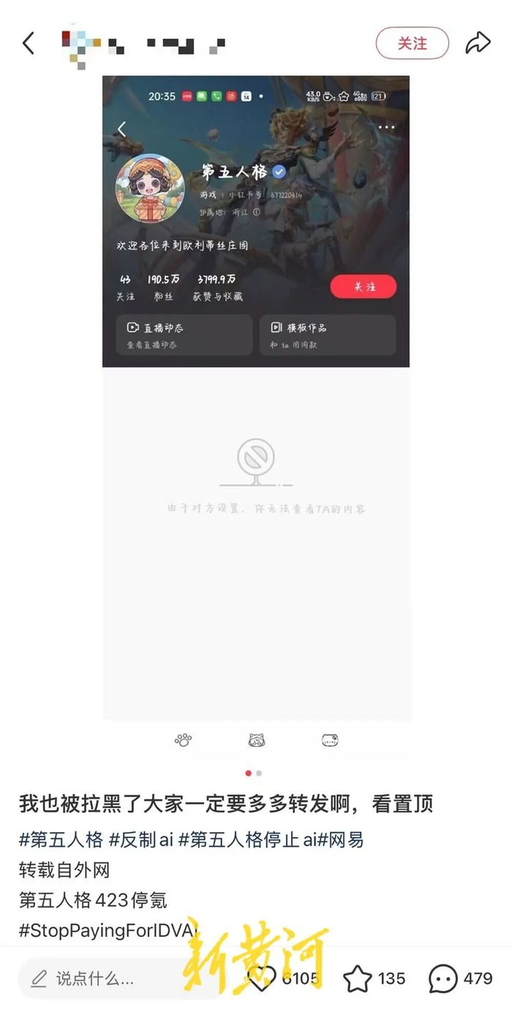 此次关于《第五人格》的AI争议愈演愈烈,广大玩家则在社交平台通过多种方式进行抵制。有人更换头像、昵称来表达不满,有人到官方账号评论区刷屏“停止使用AI”“不为AI买单”等,以此发出抗议。有玩家明确表明如果官方继续使用AI,将停止氪金支持,甚至玩家群体计划于4月23日发动集体抗议。然而,《第五人格》迟迟没有对此作出回应,却有玩家发现官方账号悄悄拉黑用户、删除评论或改图。