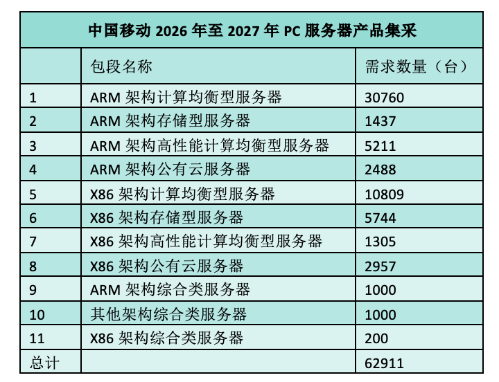 C114讯 4月18日消息(九九)中国移动官网昨日发布2026年至2027年PC服务器产品集中采购项目招标公告,集中采购PC服务器约6.29万台。其中ARM架构服务器总采购量达40896台,占比达65.01%,创国内运营商单批次集采ARM架构占比纪录。