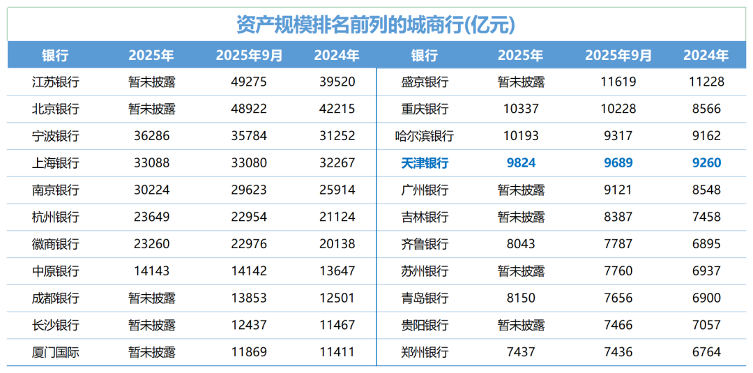 目前,已有14家城商行资产规模突破万亿,天津银行若达成目标,万亿城商行数量将增至15家。同样临近万亿规模的还有广州银行,早在2024年末其资产总额便达到9121亿元,若以10%资产规模扩表增速计算,2025年末该行亦可实现突破万亿。