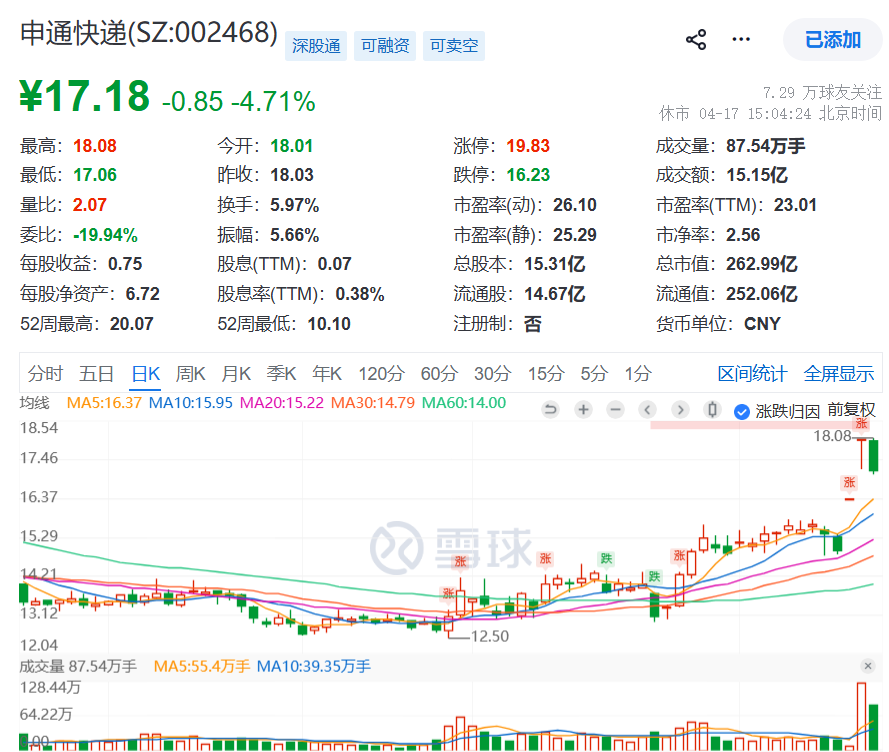 1月至今,申通快递股价上涨28%,申通快递市值263亿