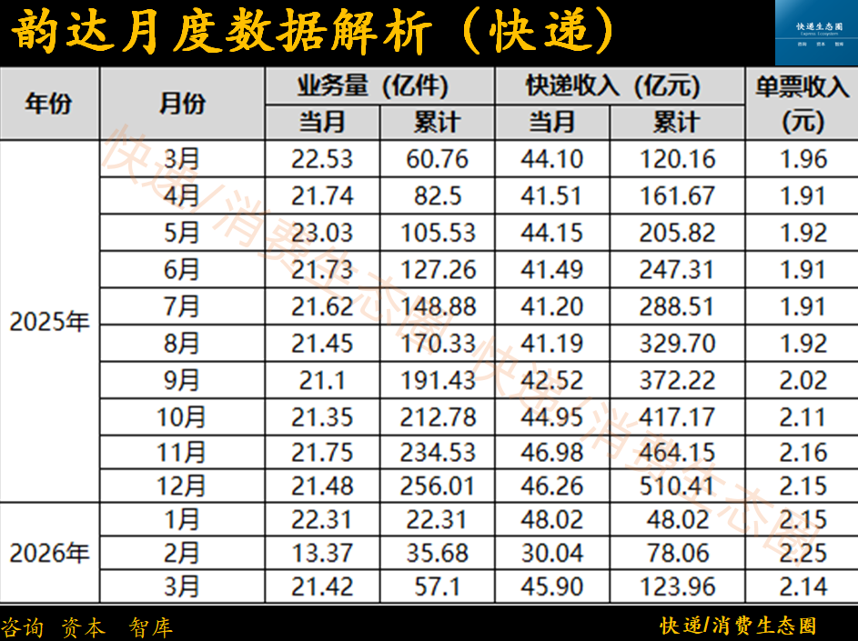 4月17日,韵达股份(002120.SZ)发布2026年3月基础数据,2026年3月快递服务业务收入45.9亿元,同比增长4.08%;完成业务量为21.42亿票,同比下降4.93%;快递服务单票收入为2.14元,同比增长9.18%。