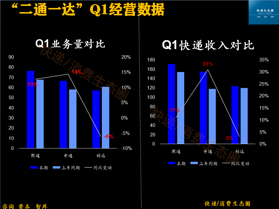 从3家公司的月度数据看,圆通收入最多,申通增速最快,韵达连续两个月增速为负。综合数据看,前3个月,圆通速递收入171.4亿元,申通快递收入155亿,韵达股份收入124亿。