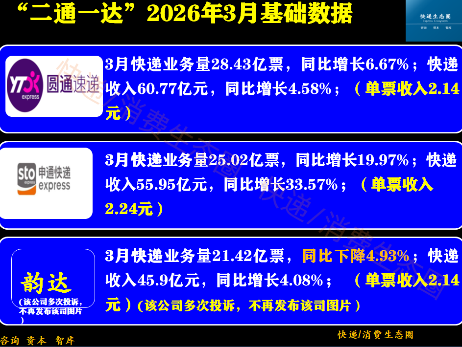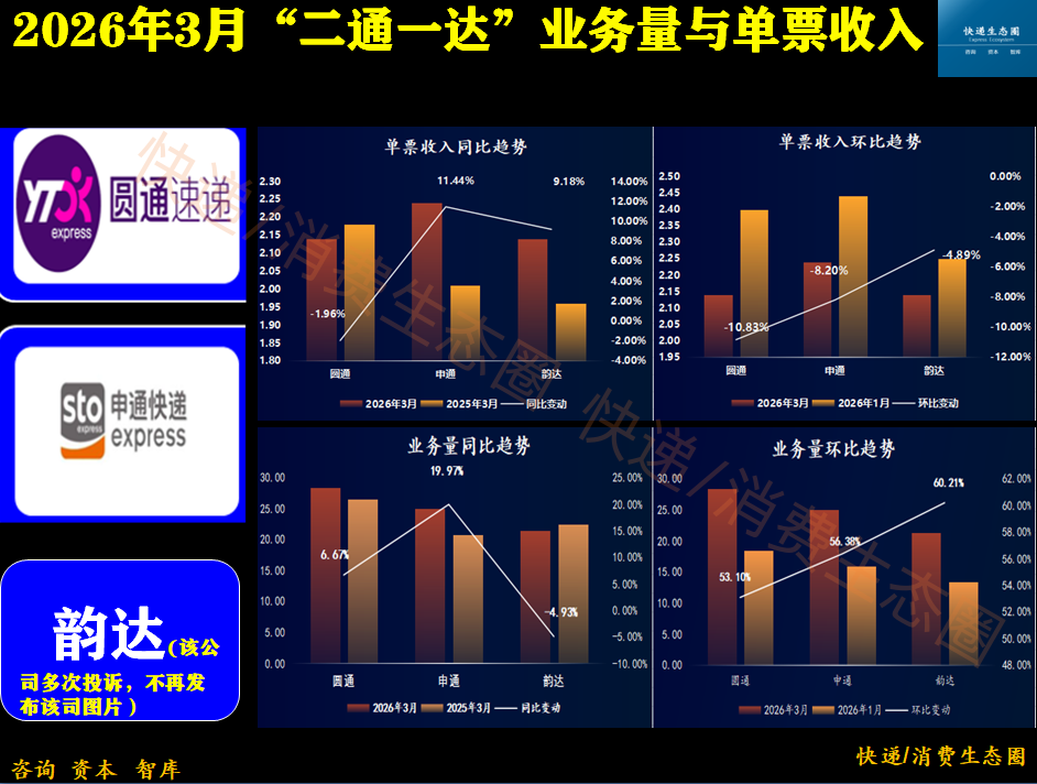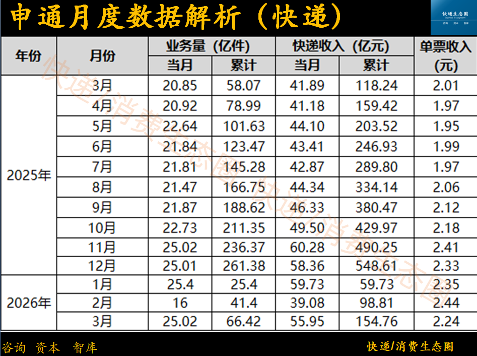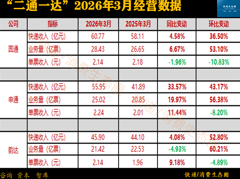 4月17日,申通快递(002468.SZ)发布2026年3月基础数据,3月快递服务业务收入为55.95亿元,同比增长33.57%;完成业务量为25.02亿票,同比增长19.97%;快递服务单票收入为2.24元,同比增长11.44%。