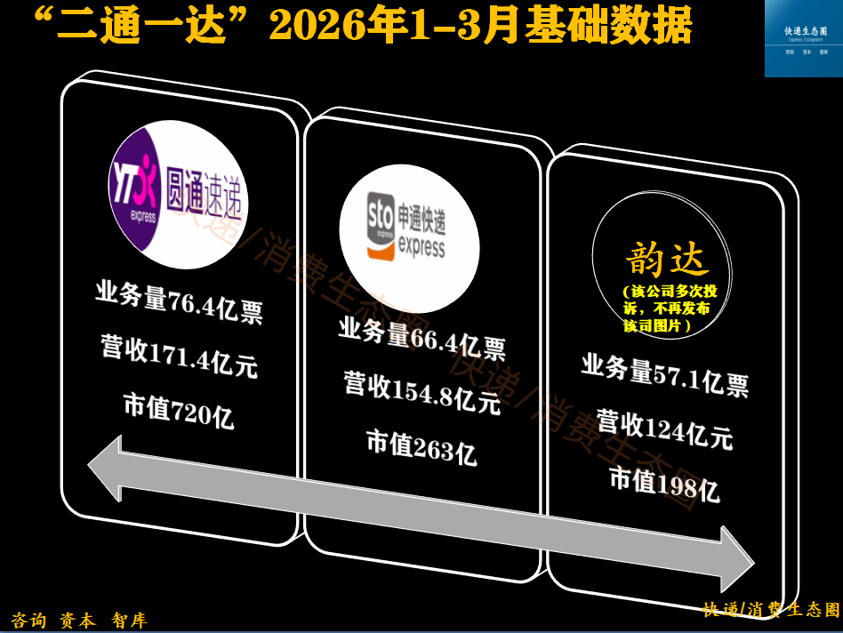 2025年全年,圆通速递营收733.4亿元,业务量311.4亿票。申通快递营收553.8亿元,业务量261.4亿票。韵达股份营收513.1亿元,业务量256亿票。