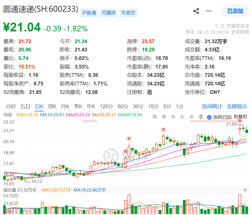 1月至今,圆通速递股价上涨28.14%,圆通速递市值720亿。