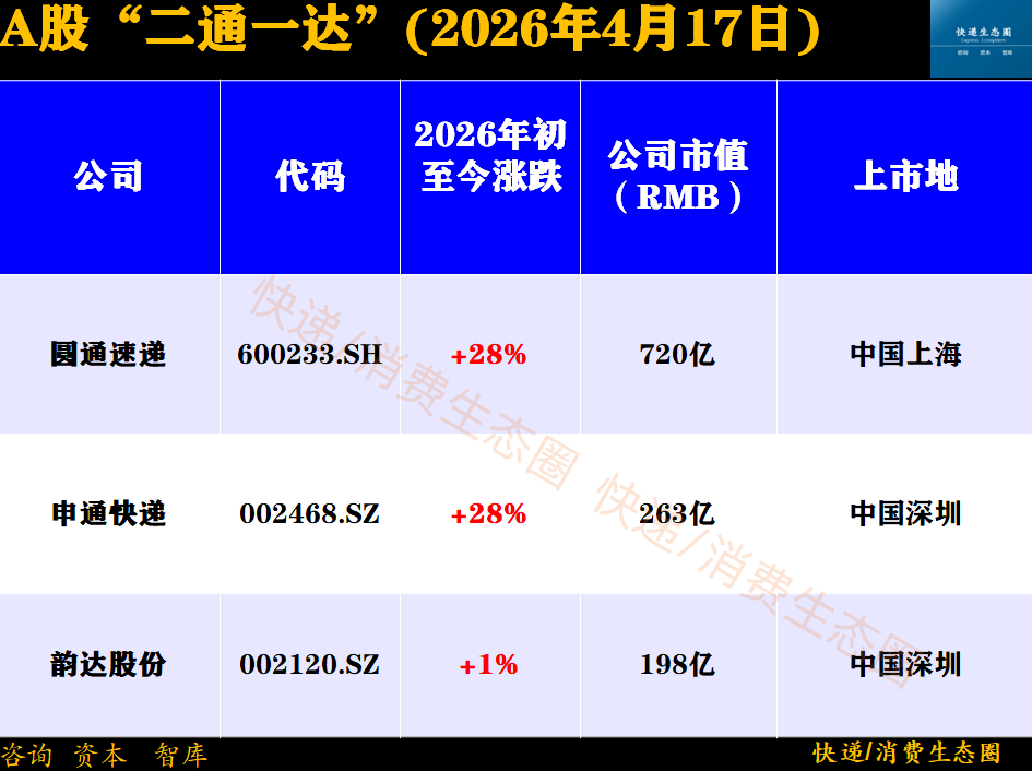 4月27日,申通快递将发布一季度报告;早前申通已经发了一季度业绩预告,一季度