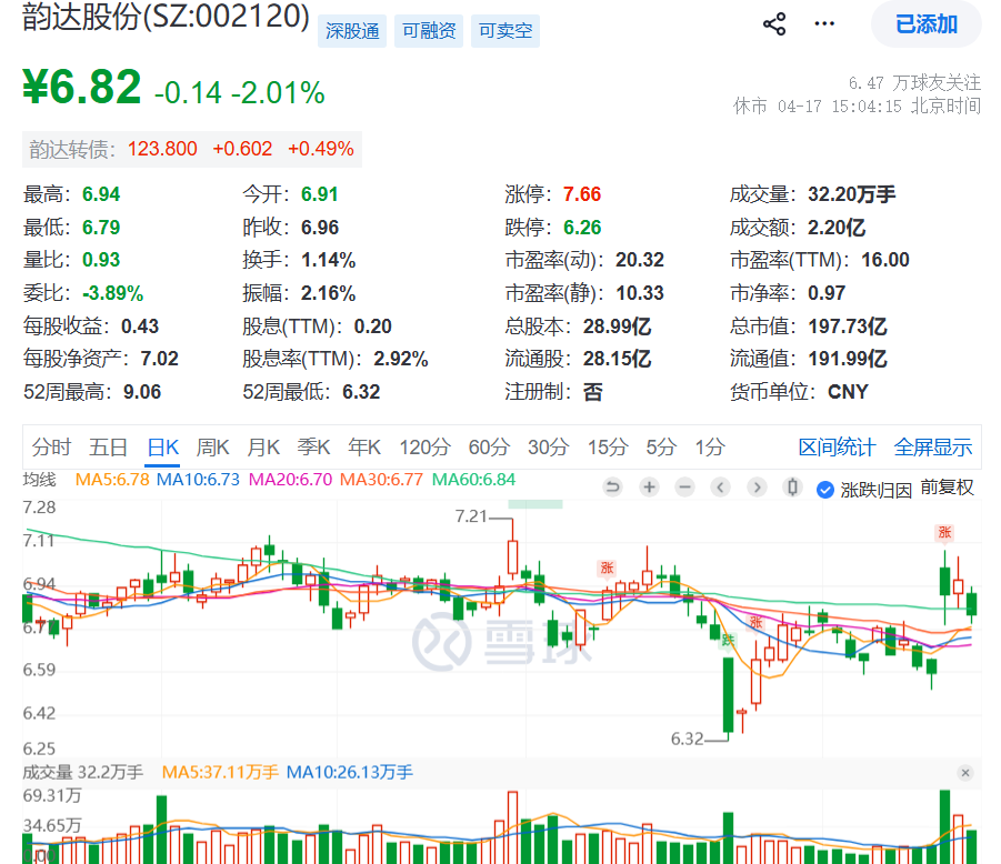 1月至今,韵达股份股价上涨1%,韵达股份市值198亿。