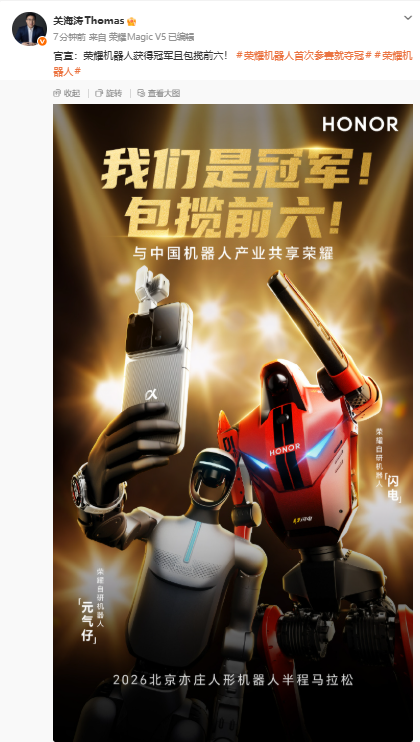 荣耀CMO关海涛发文官宣:荣耀机器人获得冠军且包揽前六!