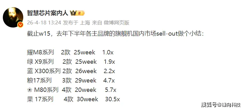 4月18日行业人士“智慧芯片案内人”就提供了去年下半年,国内主流六大品牌当家旗舰截至2026年W15周的累计销量对比数据。我们一起来看一下: