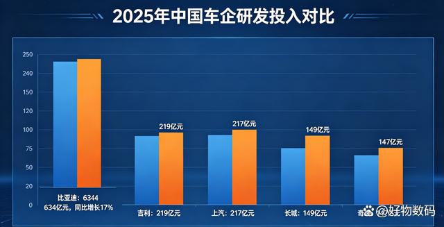 研发投入则是决定车企未来竞争力的关键,比亚迪在这一领域的投入堪称“断层领先”。2025年比亚迪研发投入高达634亿元,同比增长17%,这一数字不仅远超吉利(219亿元)、上汽(217亿元)、长城(149亿元)、奇瑞(147亿元)等企业,甚至超过了吉利、长城、奇瑞三家车企的研发投入总和。持续高额的研发投入,也让比亚迪在易四方、云辇、刀片电池等核心技术上持续领跑,为产品竞争力提供了坚实支撑。