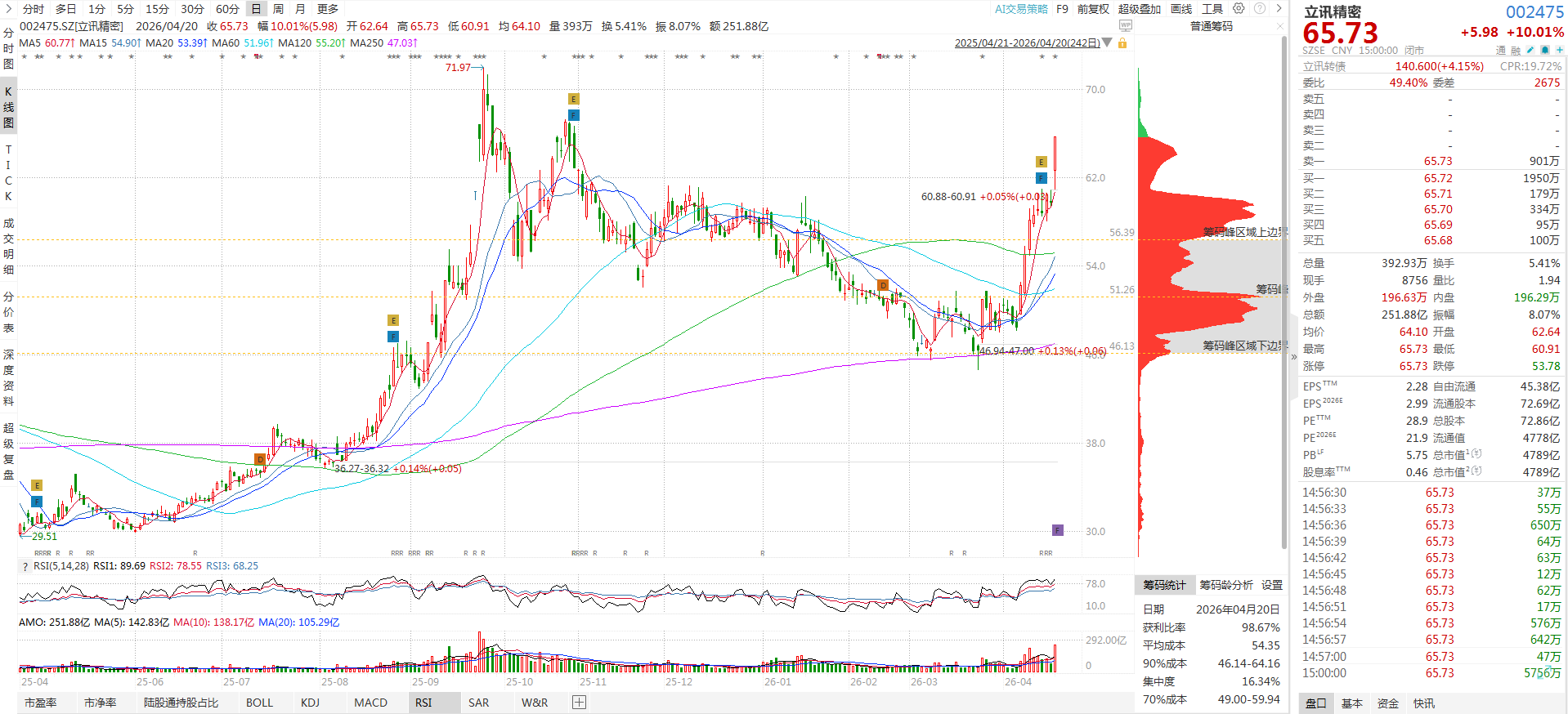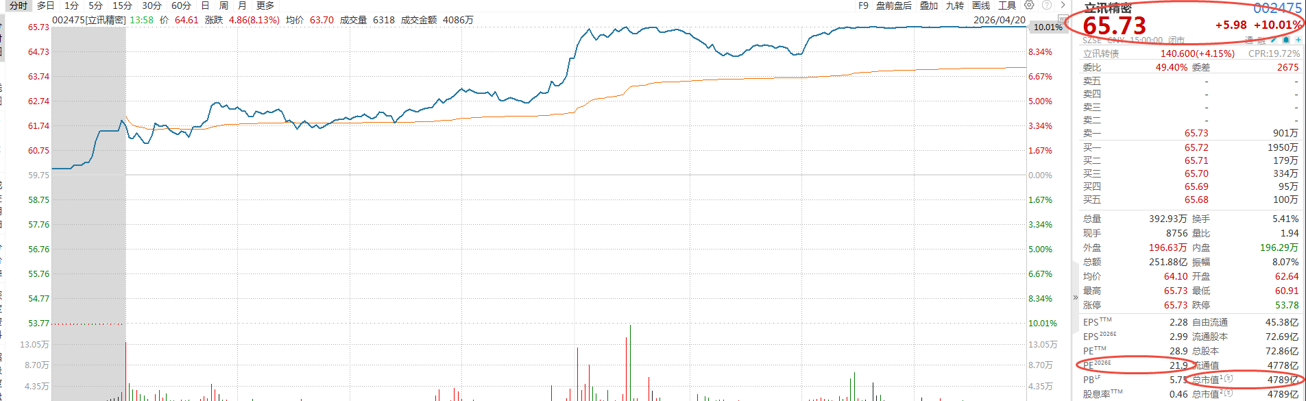 4月20日,立讯精密(002475)午后突然拉升,一度触及涨停板,截至发稿报65.73元/股,涨幅达10.01%,成交金额爆量至251.9亿元,总市值达4789亿元。消息面上,荣耀机器人(核心股)在2026北京亦庄半程马拉松暨人形机器人(核心股)半程马拉松比赛中包揽前六名,立讯精密作为荣耀机器人的核心供应商,承接整机代工与精密结构件制造,引发资金助推。此外,公司上周发布的2025年年报与2026年一季报业绩亮眼,进一步夯实股价上涨基础,清晰展现立讯精密从单一"果链龙头"向"AI硬件+汽车智能化+算力(核心股)基建"三大赛道全面布局的战略转型。