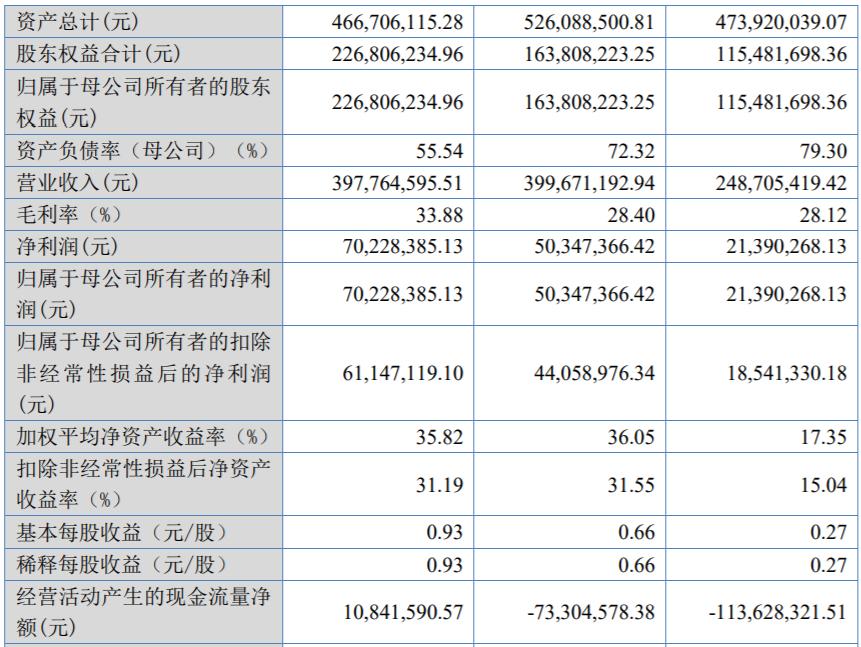 业绩方面,2022年至2024年,公司分别实现营业收入2.49亿元、4.00亿元及3.98亿元;实现净利润2139.03万元、5034.74万元和7022.84万元。2024年增利不增收。