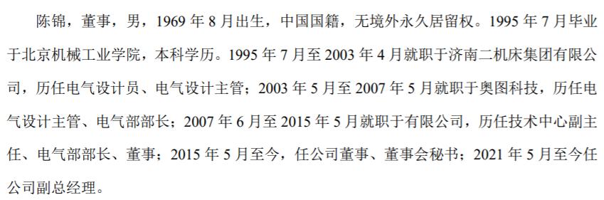 陈锦,董事,男,1969年8月出生,中国国籍,无境外永久居留权。1995年7月毕业于北京机械工业学院,本科学历。1995年7月至2003年4月就职于济南二机床集团有限公司,历任电气设计员、电气设计主管;2003年5月至2007年5月就职于奥图科技,历任电气设计主管、电气部部长;2007年6月至2015年5月就职于有限公司,历任技术中心副主任、电气部部长、董事;2015年5月至今,任公司董事、董事会秘书;2021年5月至今任公司副总经理。