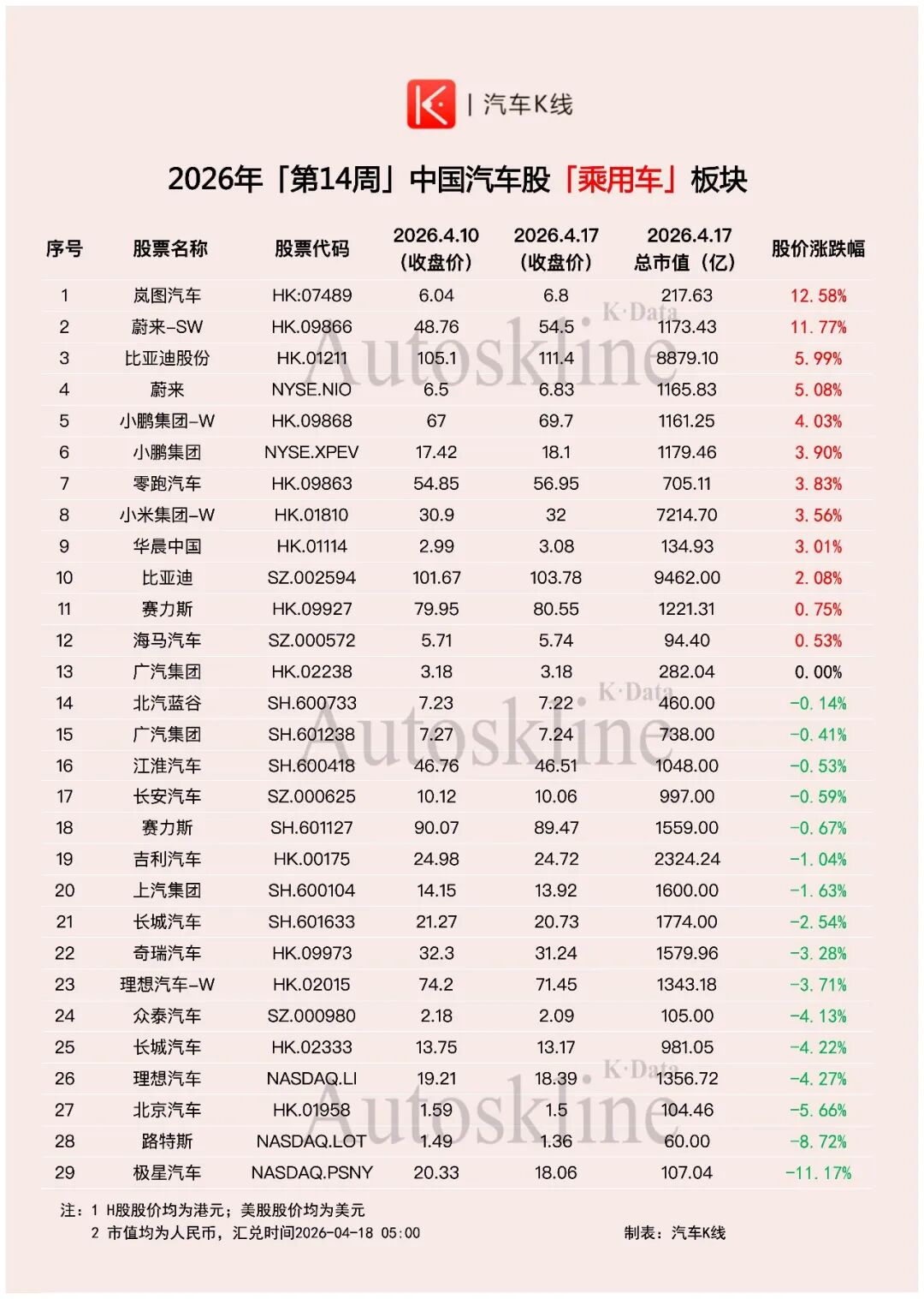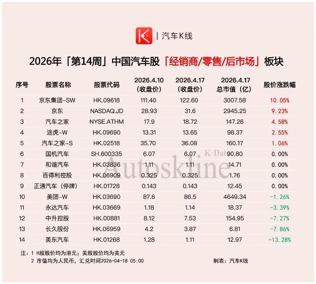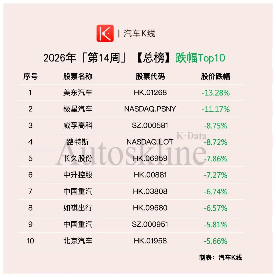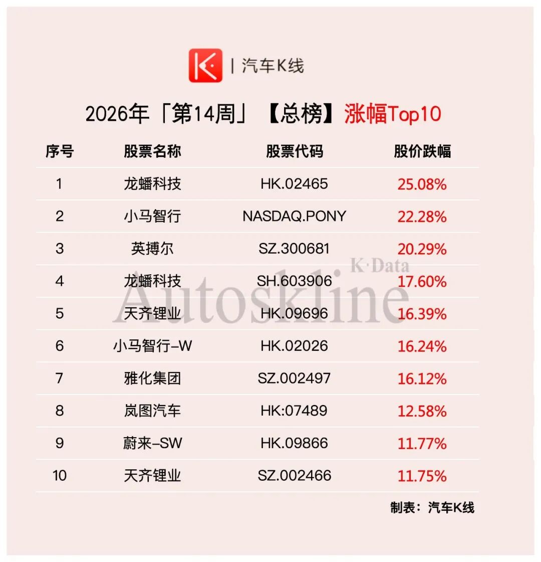 2026年第14周,《汽车K线》统计在册的137只汽车股,整体股价平均上涨2.25%,涨幅较前一周有所收窄。