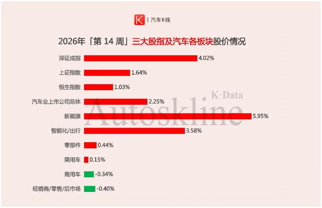 这一周,深证成指上涨4.02%,上证指数上涨1.64%,恒生指数上涨1.03%,三大股指延续普涨态势,但汽车股内部的分化却比上周更加剧烈。