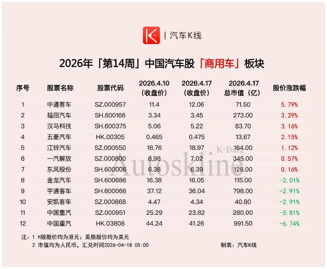 而商用车板块的中国重汽,H股下跌6.74%,A股下跌5.81%,双双进入跌幅Top10。商用车板块本周整体转跌,中通客车虽上涨5.79%,但宇通客车、安凯客车等均下跌2.91%。
