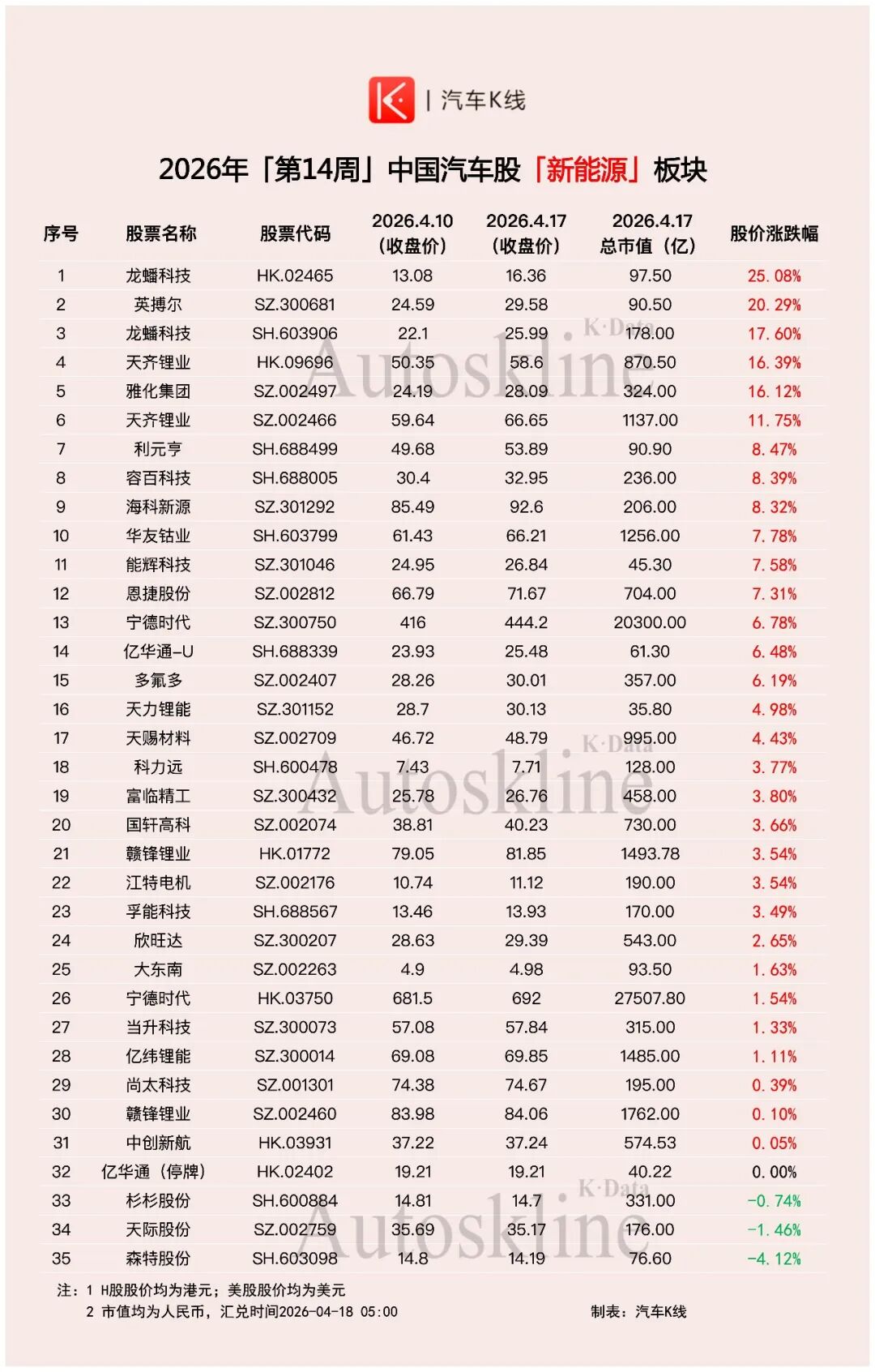 第14周的新能源板块,依然傲视汽车股。35只个股中,仅3只下跌,且跌幅普遍较小。
