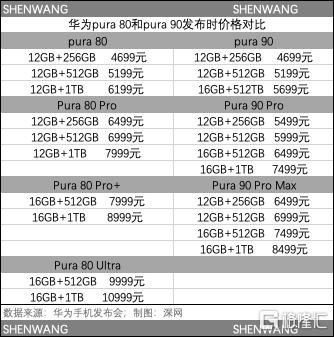 与上一代Pura80系列相比,华为Pura90标准版起售价4699元起,与上一代相比“加量不加价”;Pura 90 Pro系列的起售价5499元,比上一代降价了1000元。