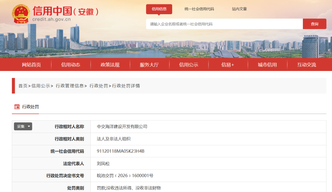 据“信用安徽”消息,近日,中交海洋建设开发有限公司因施工单位将承包的工程违法分包,被池州市交通运输局处以罚款37.653495万元。
