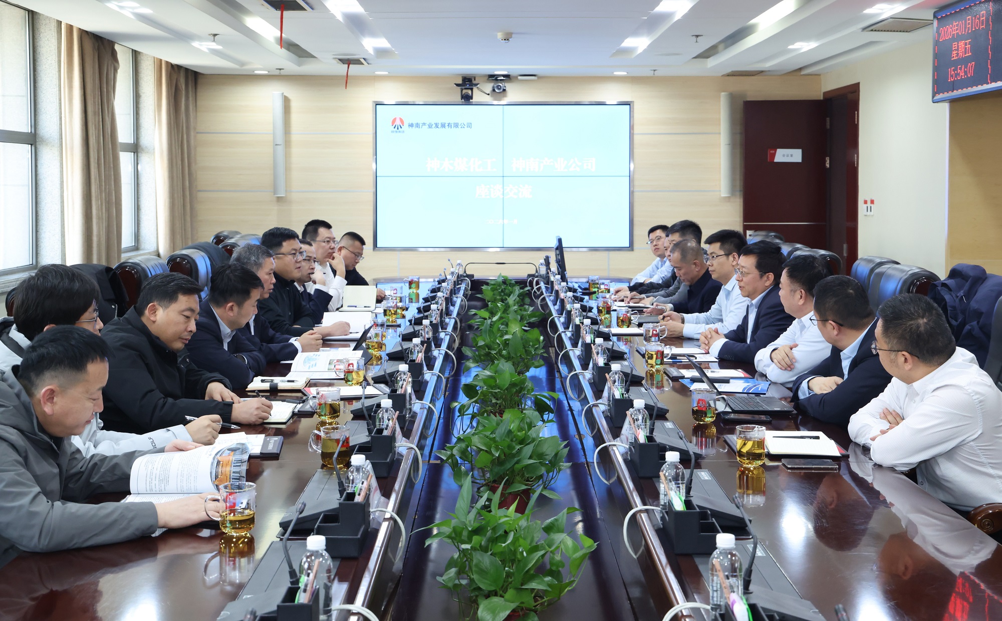 1月 16 日,神木煤化工公司副总经理张泉国一行到神南产业公司就进一步加强高效协同进行座谈交流。神南产业公司党委委员、副总经理李亚安及相关中心、子公司和职能部门负责人参加座谈,并特邀北元集团相关人员参加。