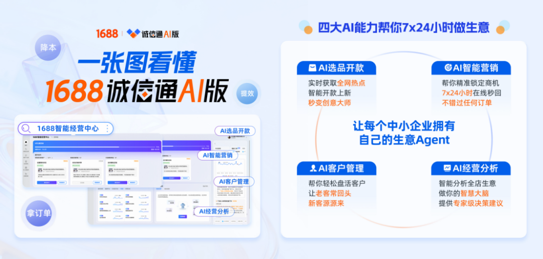 1688平台正式上线并展示的“1688诚信通AI版”,标志着B2B电商从信息撮合向智能供应链服务的深度演进。作为服务超100万商家(其中规模以上工厂超60万家)的产业互联网平台,1688将AI大模型与数字供应链基础设施深度融合,推出面向中小企业的“生意Agent”服务。实践表明,AI驱动的轻量化数字化工具,正成为中小企业转型升级的得力助手。