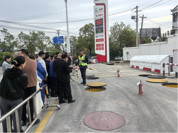 本次活动以现场观摩 +实操演示+答疑交流形式开展,现场集中开展安全警示教育,明确禁火、禁手机、防静电管控要求,规范静电释放、应急疏散、消防器材使用流程。参训人员实地学习加油机运维、油气回收常态化巡检、密闭防渗漏管控等关键要点,观摩标准化加油六步法、卸油安全规范,同步学习配电室、有限空间作业安全准则。