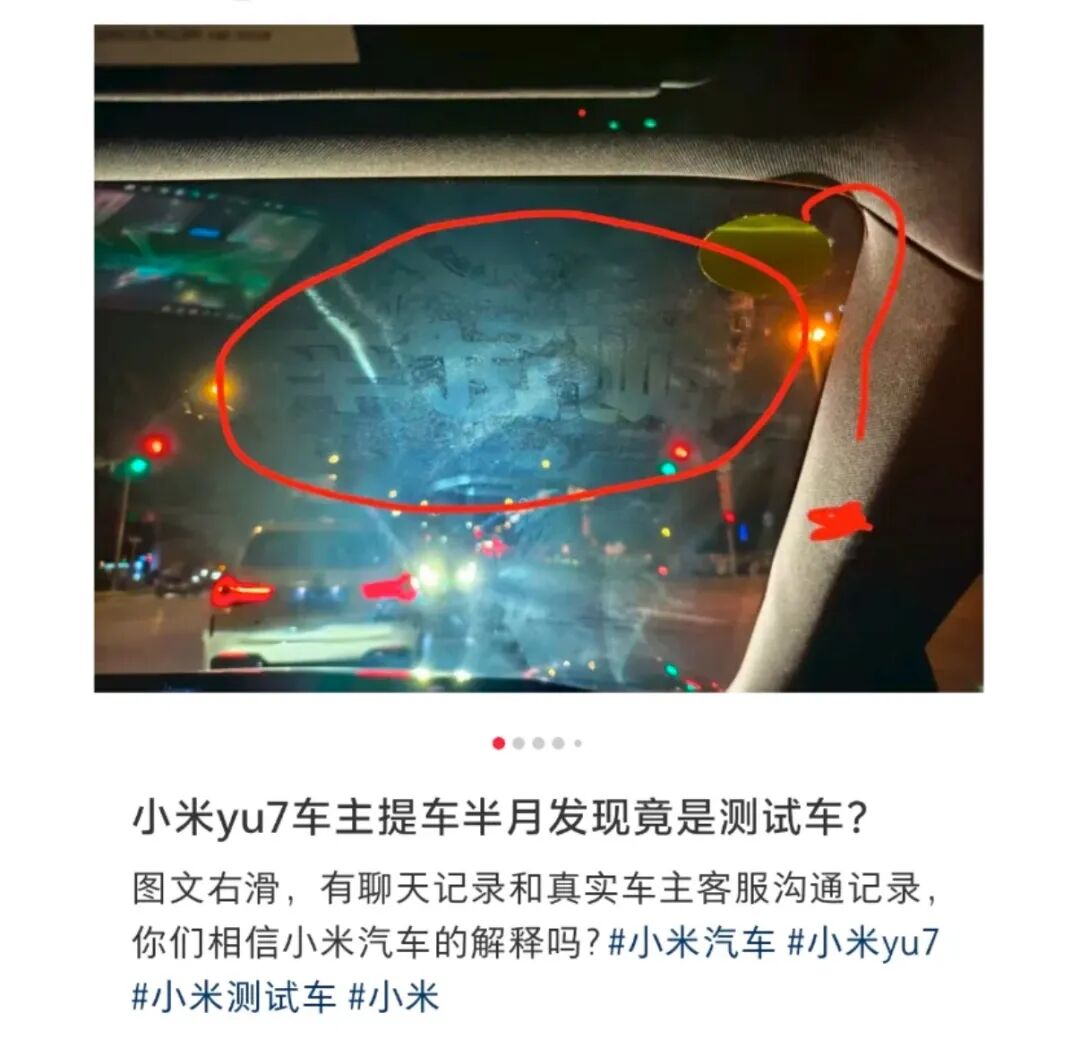 有多位小YU7 车主在社交平台反映,提车后发现前挡风玻璃有“测试车”字样痕迹