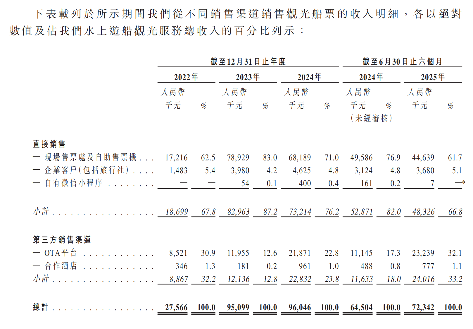 瘦西湖表示,公司与多家第三方售票渠道合作,包括线上旅游平台及合作酒店,以扩大销售网络。2023年到2025年上半年,瘦西湖通过第三方渠道售出的水上游览票款分别占该项服务收入约12.8%、23.8%及33.2%(32.1%来自OTA平台,1.1%来自合作酒店),包括美团、携程、抖音、同程等。