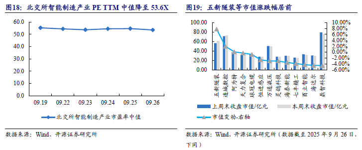 本周,从估值表现看,北交所智能制造产业市盈率TTM中值降至53.6X。从本周个股市值表现来看,五新隧装+7.79%、连城数控+1.95%、阿为特+0.10%分列市值涨跌幅前三甲。(智能制造公司类别:包含机械设备、机械零件制造、军工制造、交运设备、电气设备等细分行业)
