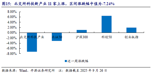 从周度涨跌幅数据来看,2025年9月22日至2025年9月26日,北交所科技新产业156家企业中11家上涨,区间涨跌幅中值为-7.24%,创远信科+16.85%,捷众科技+9.70%,锦好医疗+8.23%,五新隧装+7.79%,奥迪威+6.95%位列涨幅前五。北证50、沪深300、科创50、创业板指周度涨跌幅分别为-3.11%、+1.07%、+6.47%、+1.96%。