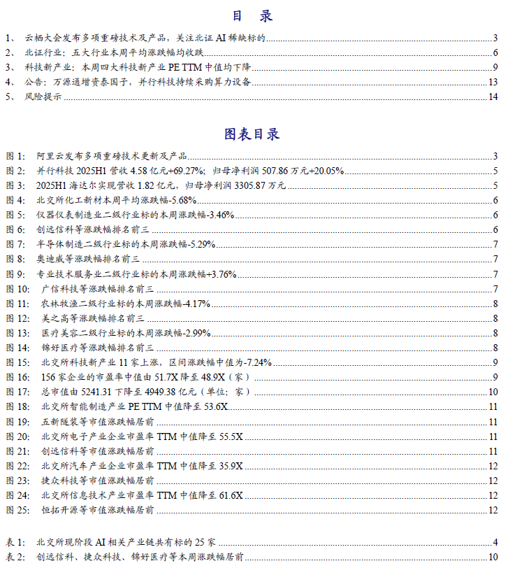 2025年9月24日,2025云栖大会在浙江省杭州市云栖小镇举行。阿里云发布多项重磅技术更新及产品,全面呈现了其在大模型、云计算、AI等领域的最新探索与实践。阿里通义旗舰模型Qwen3-Max全新亮相。在服务器层面发布全新一代磐久128超节点AI服务器。北交所现阶段AI相关产业链共有标的25家,截至2025年9月26日总市值达到970.89亿元,涵盖芯片、算力中心基建、算力服务等方面。关注并行科技、曙光数创、海达尔等优质稀缺性标的。并行科技(839493.BJ)是国内领先的超算云服务和算力运营服务提供商,智算云平台已部署智谱大模型、DeepSeek-R1等主流模型。并行科技2025H1实现营收4.58亿元,同比+69.27%;归母净利润507.86万元,同比+20.05%。海达尔(836699.BJ)从事精密滑轨的研发、生产与销售,在服务器领域成为国内具有影响力的滑轨供应商。2025H1海达尔实现营收1.82亿元,同比减少0.75%,归母净利润3305.87万元,同比增长3.79%,毛利率28.64%,同比增长2.05pcts。