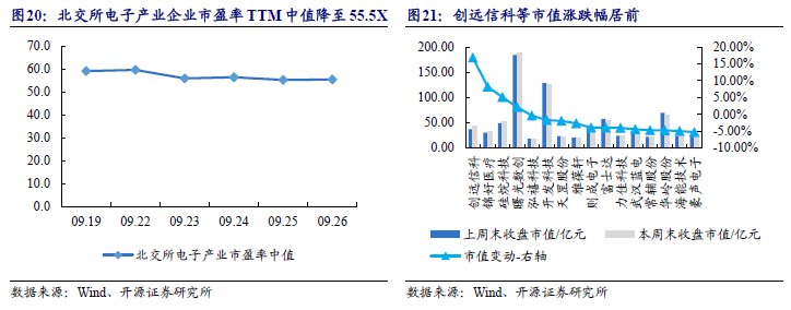 本周,从估值表现看,北交所电子产业市盈率TTM中值降至55.5X。从本周个股市值表现来看,创远信科+16.85%、锦好医疗+8.23%、硅烷科技+5.14%分列市值涨跌幅前三甲。(电子公司类别:包含消费电子、医疗电子、新能源电子设备、仪器仪表等细分行业)