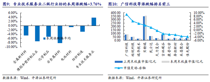 化工新材行业本周市盈率中值降至44.4X,广信科技+9.01%、硅烷科技+5.14%、瑞华技术+3.76%涨跌幅排名前三。(化工新材包含金属新材料、橡胶和塑料制品业、化学制品、非金属材料、电池材料、纺织制造、专业技术服务业等二级行业)