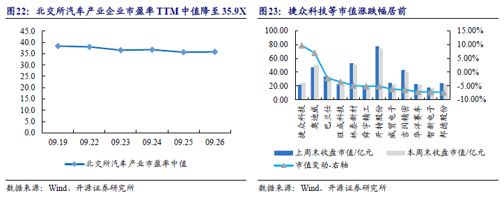 本周,从估值表现看,北交所汽车产业市盈率TTM中值降至35.9X。从本周个股市值表现来看,捷众科技+9.70%、奥迪威+6.95%、巴兰仕-2.17%分列市值涨跌幅前三甲。(汽车公司类别:包含汽车硬件、汽车电子、汽车整车制造、汽车材料、内外饰设计、后市场服务等细分行业)