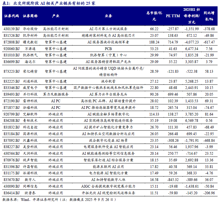 北交所现阶段AI相关产业链共有标的25家,截至2025年9月26日总市值达到970.89亿元,涵盖芯片、算力中心基建、算力服务等方面。