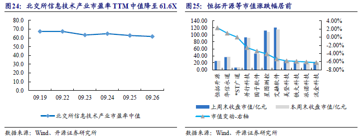 本周,从估值表现看,北交所信息技术产业市盈率TTM中值降至61.6X。从本周个股市值表现来看,恒拓开源+2.29%、华信永道+0.98%、*ST广道0.00%分列市值涨跌幅前三甲。(信息技术公司类别:包含集成电路、高端软件、智能终端、高端服务器、网络和通信、云计算等细分行业。)