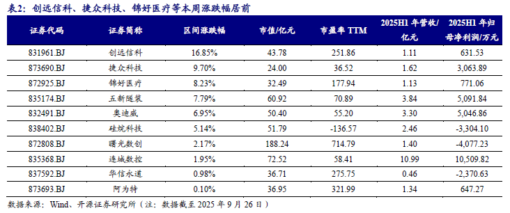 本周(2025年9月22日至2025年9月26日),前十大涨跌幅标的分别是创远信科、捷众科技、锦好医疗、五新隧装、奥迪威、硅烷科技、曙光数创、连城数控、华信永道、阿为特。