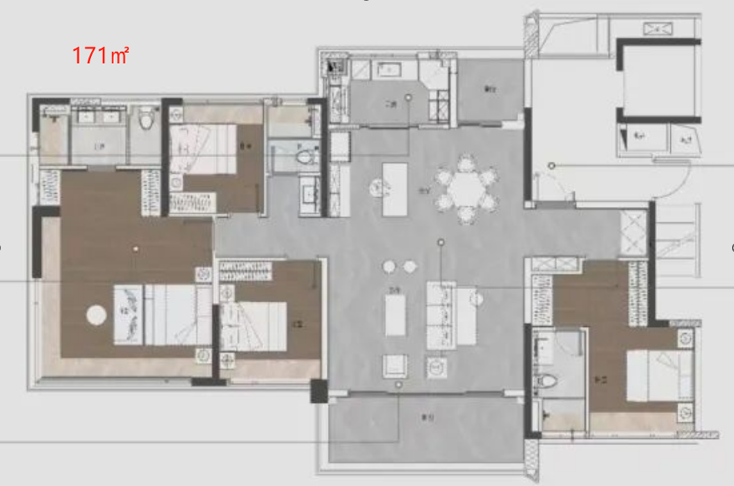 最后是171㎡的户型,双主套设计,三个卫生间。
