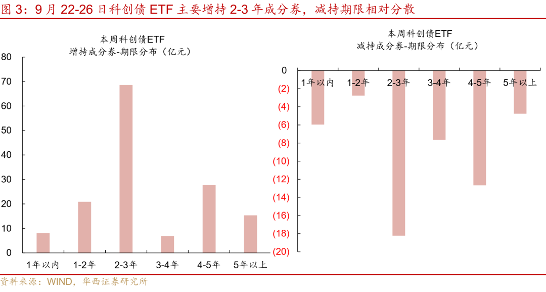 增持债券主要是25年9月央企新券,行业涉及券商、电力、能源等板块,期限集中在2-3年,例如本周成分券金额增持超过3亿元的6只券,25招证K2、25电建K3、25电建K4、25国能K2、25国能K3、25招证K1,均是央企发行,4只期限在2-3年,其中,中国电力建设、国家能投集团所发债券均是9月新券。
