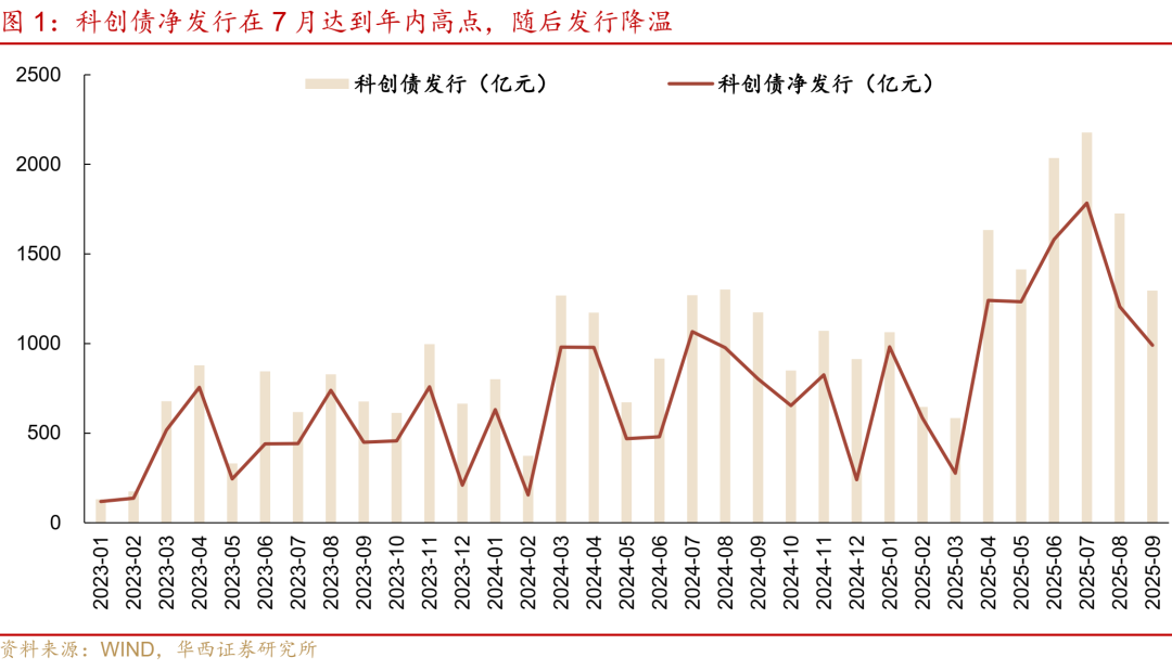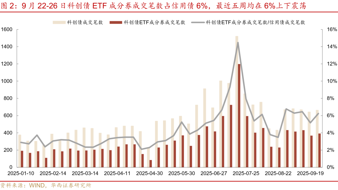 科创债发行降温。科创债净发行在7月达到年内高点后呈下滑趋势,9月22-28日净发行仅141亿元,环比下滑282亿元。科创债成交热度同样在7月达到高点,随后降温。在科创债ETF上市首周(7月14-18日)时,成交热度达到年内高点,科创债成交笔数、科创债ETF成分券成交笔数占信用债的18%、14%,最近五周在10%、6%上下震荡,相对高点降温,不过仍高于科创债ETF上市前。