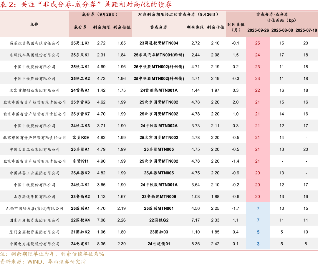 个券策略维度,关注“非成分券-成分券”差距相对高/低的债券。若差距较高,则对应“成分券”被超买,“非成分券”有性价比,若差距较低,则对应“成分券”估值还有压缩空间。例如,截至9月26日,7家主体“非成分券-成分券”利差高于20bp,且该利差均超过7月18日、8月8日两个相对高点,意味着其成分券被超买,“非成分券”性价比提升。具体主体为蜀道投资集团、东风汽车集团、中国中铁、北京首都创业集团、北京市国资经营公司、中国兵器工业集团、山东高速集团。