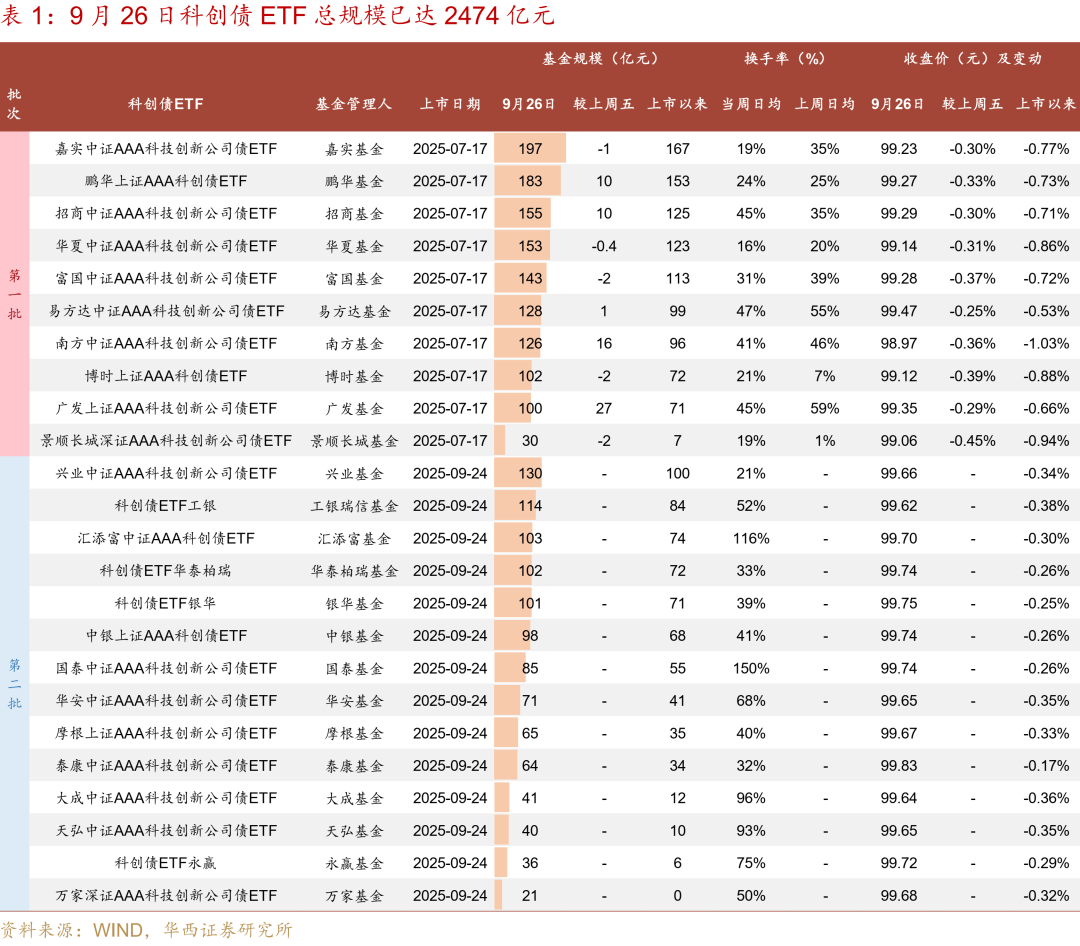与科创债发行减量不同,随着第二批科创债ETF上市,9月26日两批科创债ETF规模合计增至2474亿元。9月24日,第二批14只科创债ETF上市,首日规模增长超过630亿元,到9月26日,两批科创债ETF规模合计已接近2500亿元,周度增量807亿元,其中708亿元增量由第二批科创债ETF带来。
