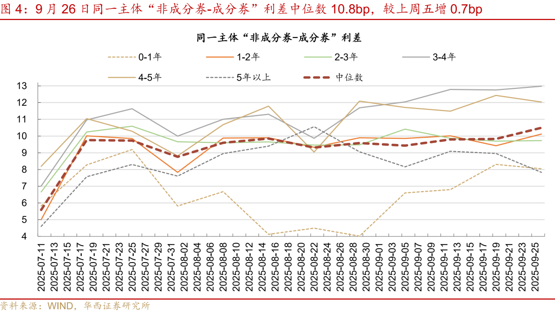 科创债ETF的买入力量,使得同一主体存在“非成分券-成分券”利差,9月26日中枢在10.8bp,较上周五微增0.7bp。“非成分券-成分券”利差在第一批科创债ETF发行之前(6月底)不明显,仅为0-2bp,上市后增至10.0bp(7月18日),7月底收窄至9bp,第二批科创债ETF启动申报时,再次增至9.9bp(8月8日),此后在10bp上下震荡。