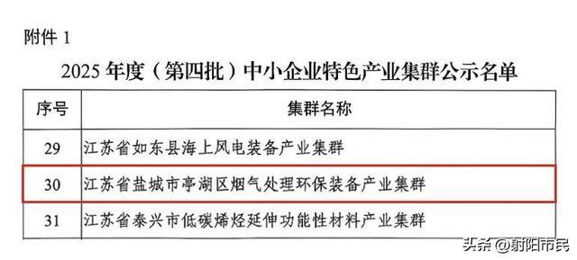 近日,工业和信息化部中小企业局发布2025年度(第四批)中小企业特色产业集群公示名单,江苏省盐城市亭湖区烟气处理环保装备产业集群成功入选。据公示名单显示,全国共公示100个产业集群,其中江苏省占6席。