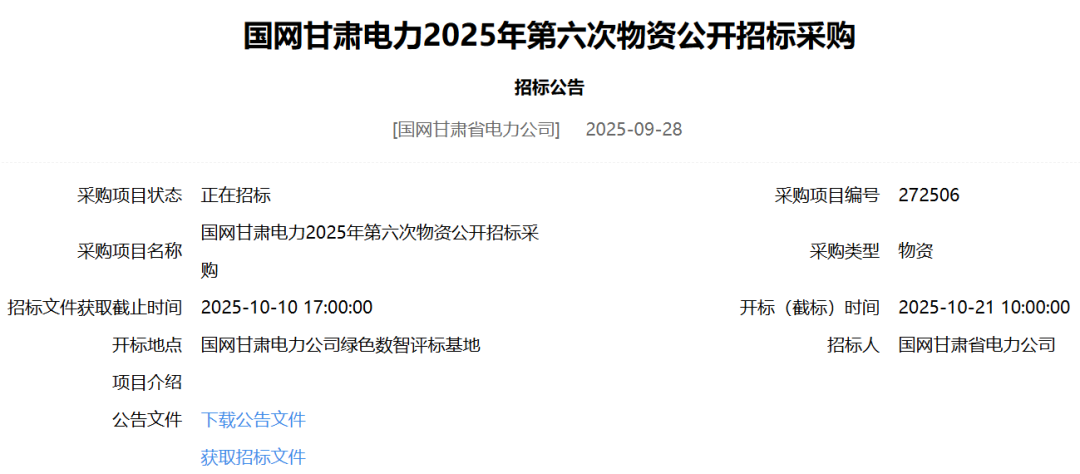 国网甘肃电力2025年第六次物资公开招标采购招标公告